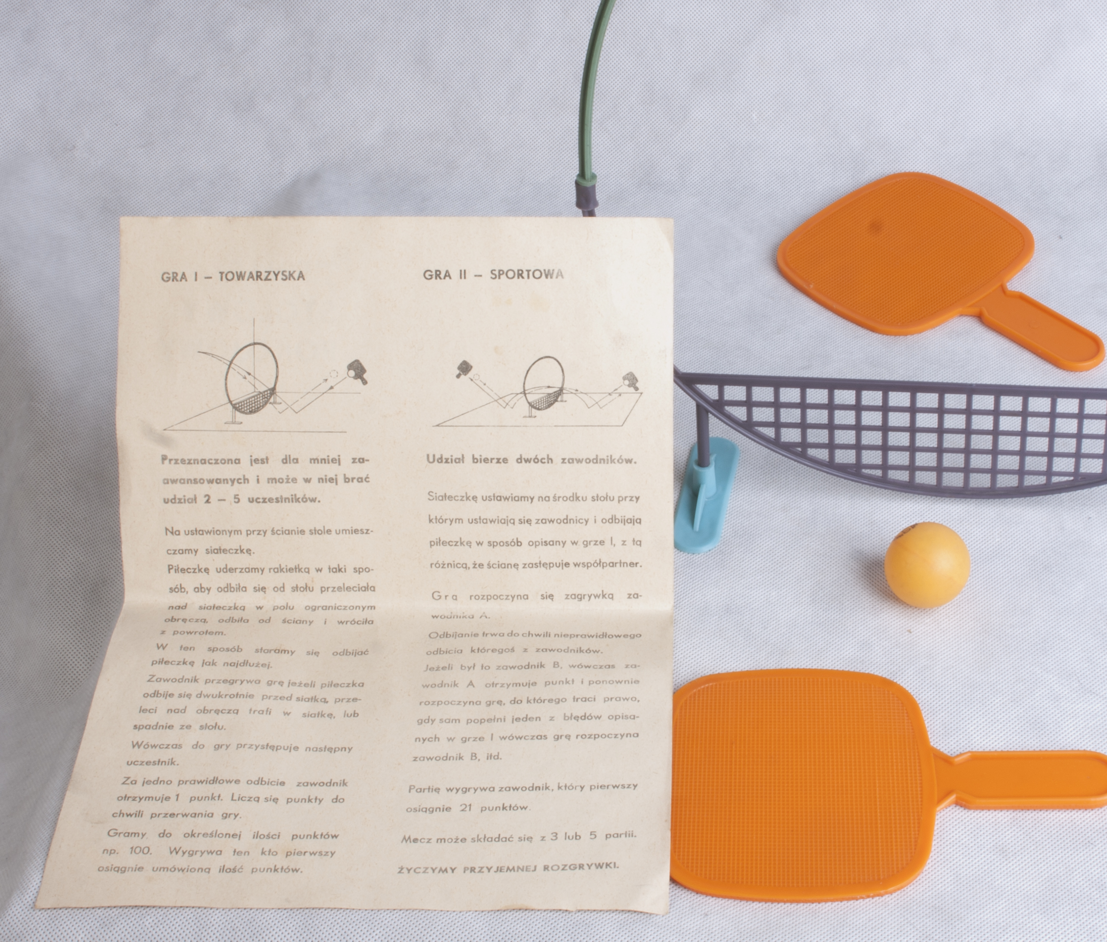 W zestawie są: dwie pomarańczowe rakietki, piłeczka, plastikowa, okrągła, składana siatka i instrukcja. Złożenie siatki polega na połączeniu czterech elementów – jest dziecinnie proste. W dołączonej instrukcji (krótkiej, zwięzłej i dokładnej, co charakterystyczne dla zabawek z tamtych czasów) znaleźć można podział na dwa rodzaje gier.