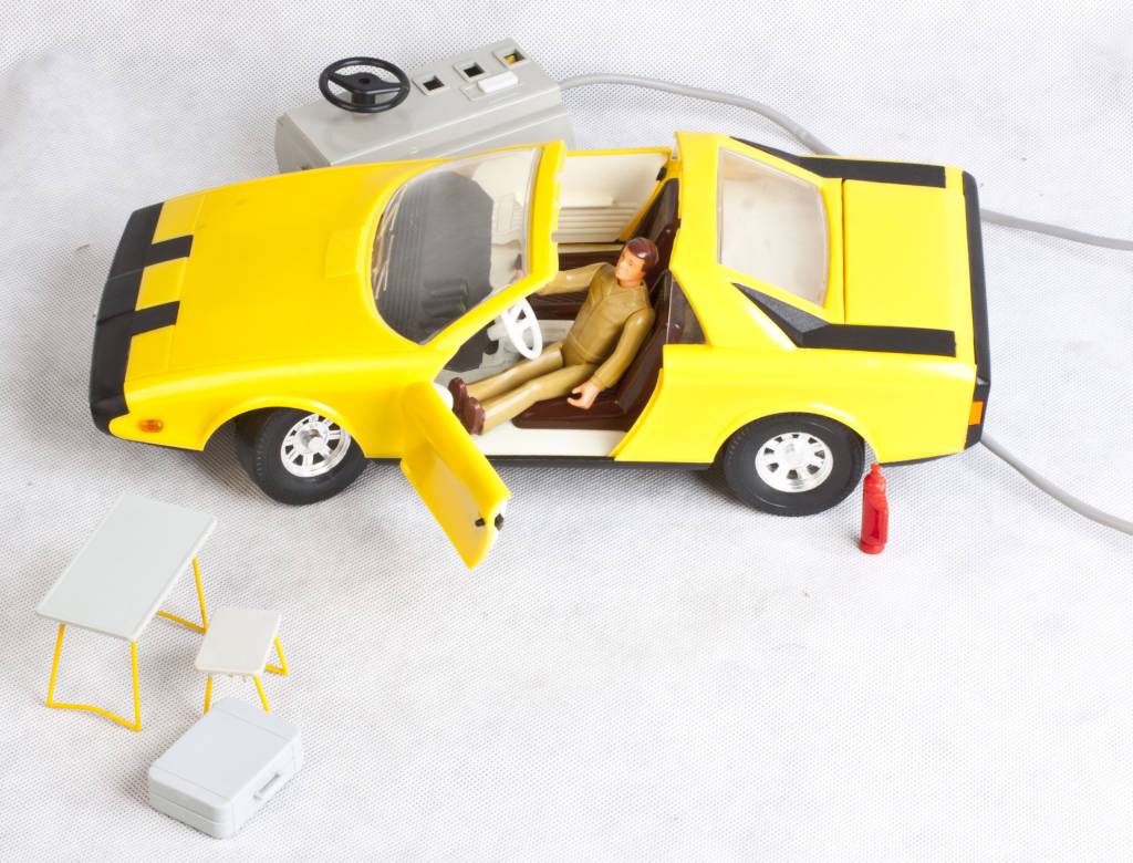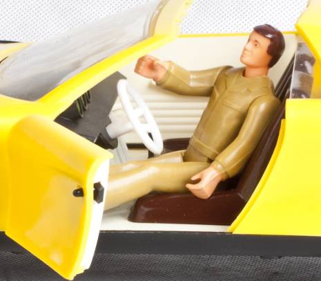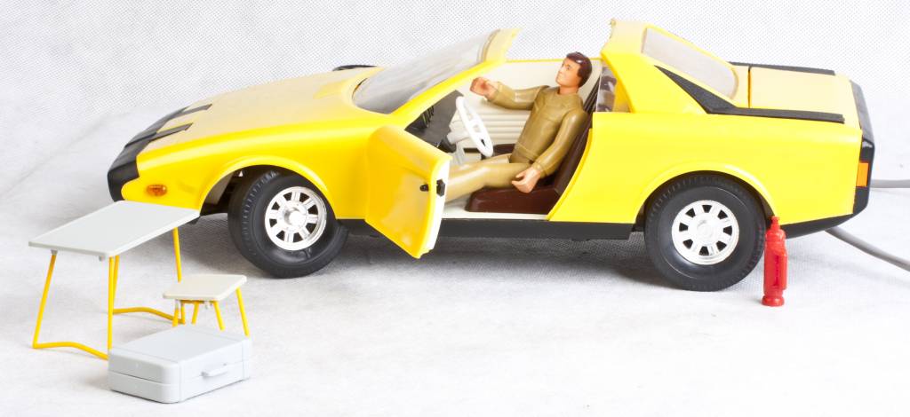 Równie ważne jak sam model są dodatki. Przede wszystkim ludzik, ale też gaśnica, stolik z dwoma taboretami oraz otwierana walizka. Jest też dach, który można zdjąć robiąc pięknego kabrioleta. Nasz egzemplarz jest w oryginalnym pudełku. Samochód jest wiernie odtworzony w środku: ruchoma kierownica, drążek zmiany biegów, hamulec ręczny, deska rozdzielcza z licznikami.