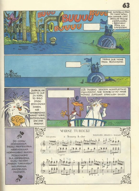 Rysownik szybko zyskał sławę i zaczęto wydawać jego komiksy. Wyszły m.in. „Na co dybie w wielorybie czubek nosa Eskimosa”, „3 przygody Sherlocka Bombla”, „Ecie pecie o wszechświecie, wynalazku i klarnecie”, „Jak ciotka Fru-Bęc uratowała świat od zagłady”, „Orient Men: Forever na zawsze” i „Antresolka Profesorka Nerwosolka” oraz „Podróż Smokiem Diplodokiem”. Dwa ostatnie są w naszym posiadaniu i to z nich pochodzą screeny. To wydania z lat 1985 i 1988.