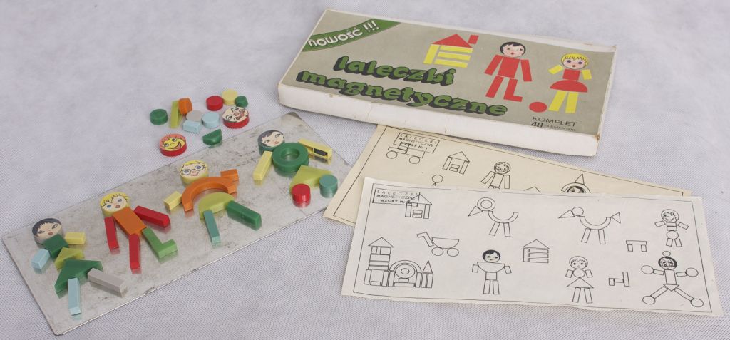 Kiedy trzy lata temu Inspekcja Handlowa przeprowadziła kontrolę producentów zabawek w wielu produktach z magnesami znaleziono uchybienia. Główne z nich to brak ostrzeżeń przed skutkami, na przykład, połknięcia namagnesowanych elementów. Laleczki Magnetyczne oczywiście takich ostrzeżeń nie zawierają, bo wtedy nikt się tym nie przejmował. Nie ma nawet ograniczenia wiekowego na pudełku. Tylko informacje „Nowość” i „Komplet 40 elementów”. W środku koła (sześć z narysowanymi twarzami), prostokąty, kwadraty, trójkąty. Żeby pobudzić do działania dołączono dwa wzory. Na nich przykłady domku, ptaka, postaci, zamku, krzesła, pociągu, samochodu, pajaca… Wszystko układa się na metalowej tacce, do której przyczepia się magnes. Pisząc to patrzę na moją Anię, która właśnie układa pałac i gwarantuje Wam, dawno nie widziałem takiego szczerego uśmiechu na jej buzi.