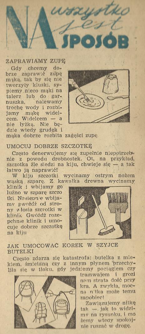 Ostatnia rozkładówka to poradnik jak samej zrobić podeszwy sznurowe, historyjka rysunkowa „O Pączku i Róży” i dział Na wszystko jest sposób. Nie wiesz jak umocować korek w szyjce albo zaprawić zupę? Tu się tego dowiesz. Gospodyni pisze też jak przygotować sos chrzanowy do zimnych mięs.