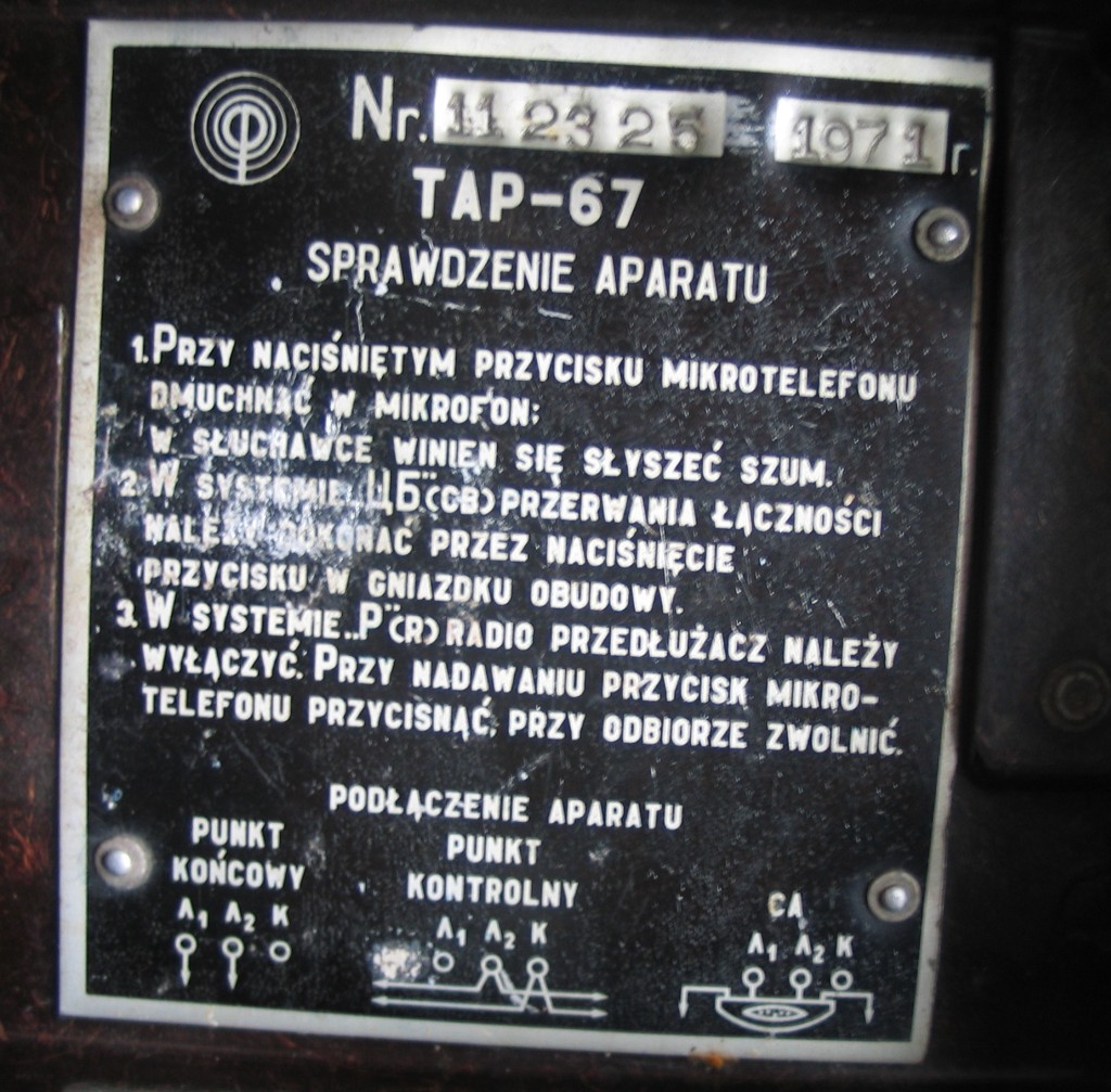 Napisy są tu w językach polskim i rosyjskim, ale podobno to produkcja węgierska. Według tabliczki nasz aparat polowy Tap-67 pochodzi z 1971 roku. Zasilany był z akumulatora o napięciu 9V. Umieszczony jest w niezniszczalnej skrzynce. Całość waży ponad 2.5 kilo. Niestety kompletnie nie znamy się na jego obsłudze, a instrukcja sprawdzania aparatu tylko pogarsza sprawę. Znaleźliśmy informację, że „aparat ten pracował w systemie MB lub CB. W systemie MB wywołanie centrali lub współpracującego abonenta następowało poprzez wysłanie zewu induktorowego, zaś w systemie CB poprzez podniesienie mikrotelefonu”. Ale nie pytajcie co znaczy MB i CB…