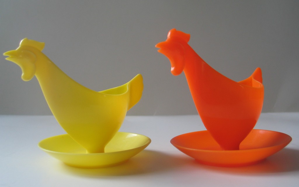 Figurki kur gotowe na pyszne jajka znajdowały się w wielu domach. Ich piękne kolory rozświetlały szare kuchnie i na pewno dodawały dodatkowego smaku rozlanym żółtkom i puchowym białkom. W naszej kolekcji znajdują się dwie sztuki wyprodukowane przez legendarną DDR-0wską firmę Sonja Plastic.