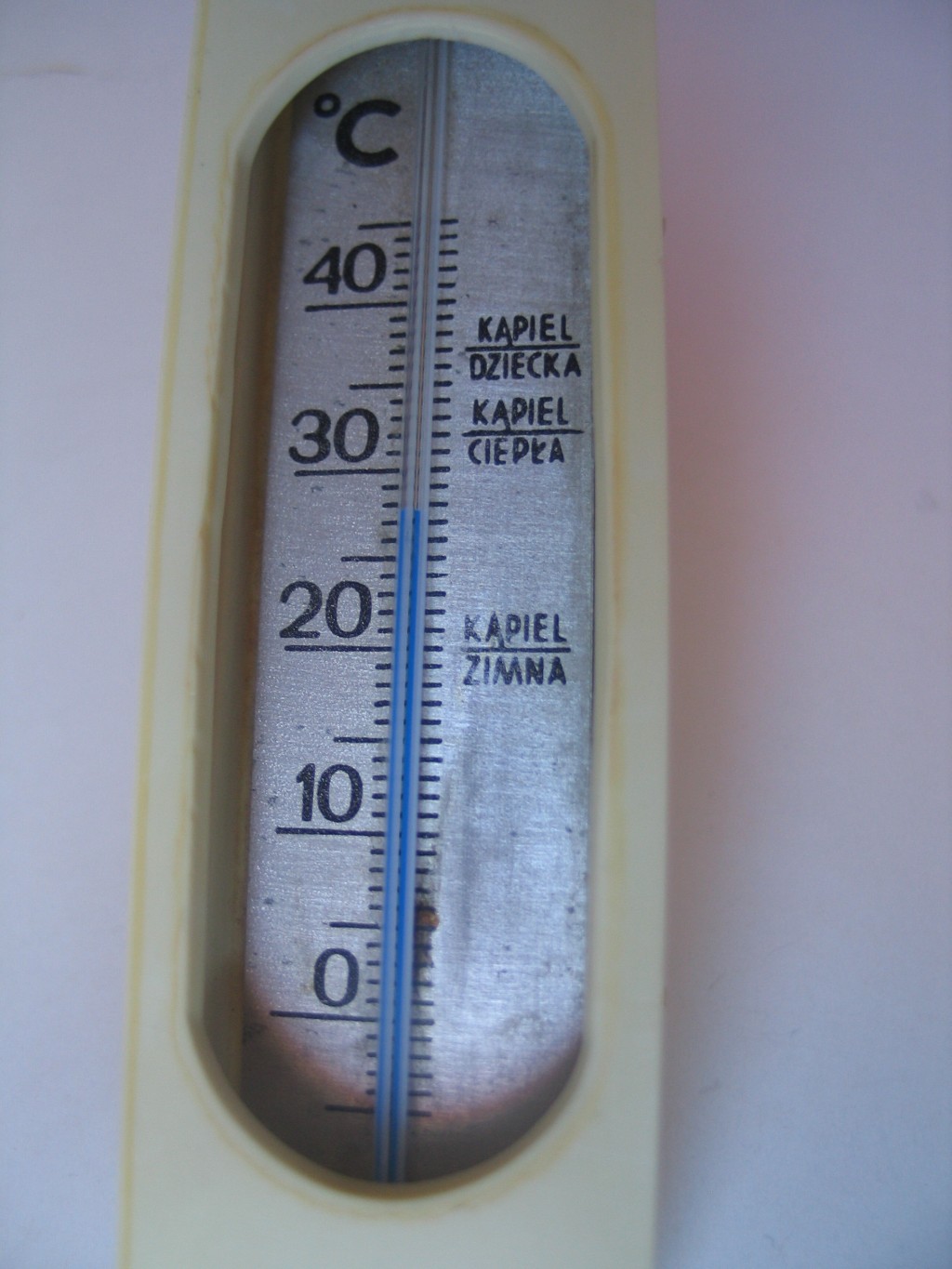 Udało nam się go zdobyć w warszawskim Emausie. Byłby zwykłym poręcznym, zgrabnym termometrem, gdyby nie fakt, że informuje nas o prawidłowych temperaturach kąpieli. Jak wiemy ta czynność nie było wtedy tak rozpowszechniona jak dzisiaj. W wielu domach porządną kąpiel brało się raz w tygodniu, często nie zmieniając wody między poszczególnymi członkami rodziny. Problem z higieną był powszechny, na co zwracały uwagę chociażby ówczesne gazety.