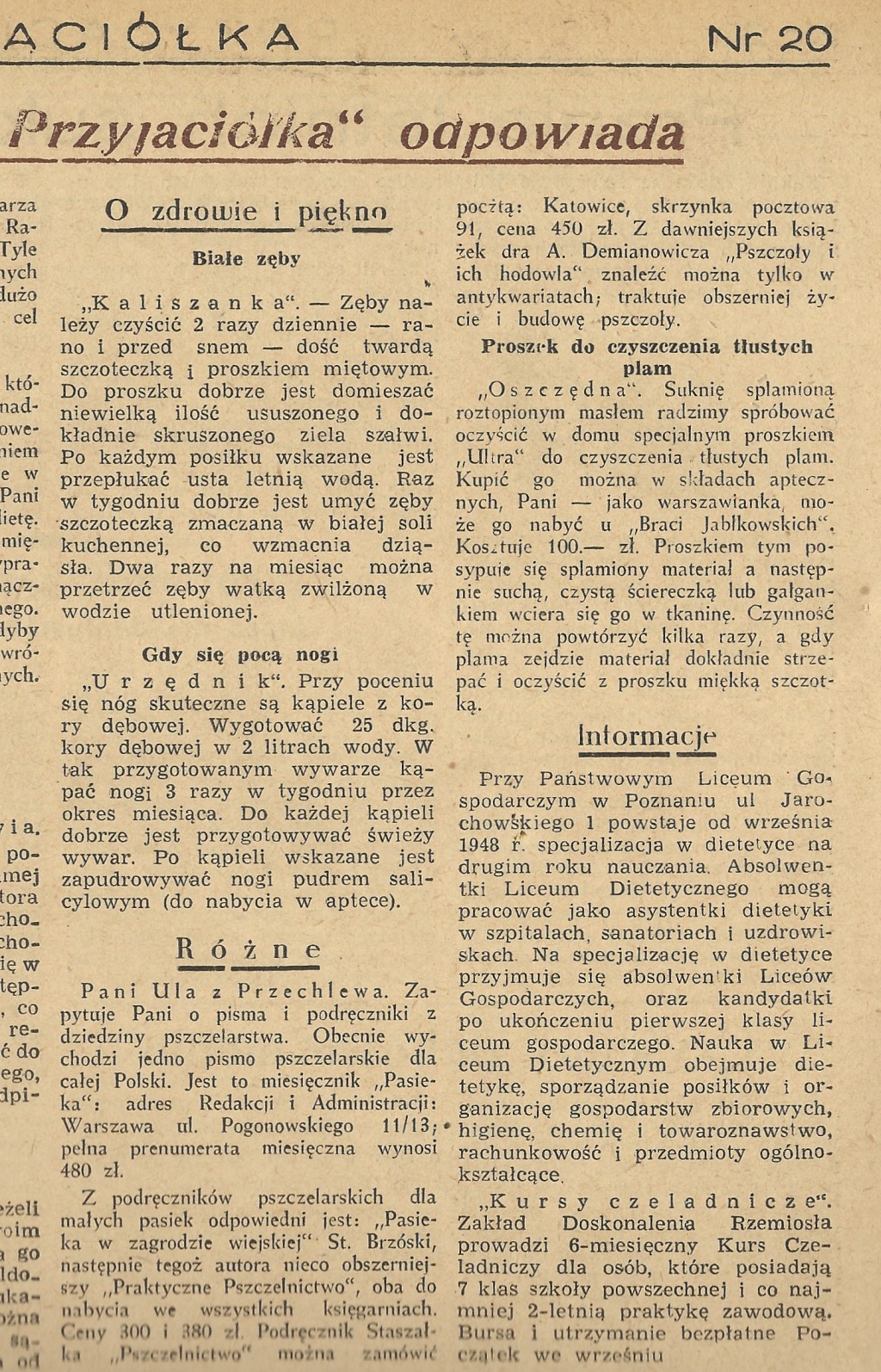 Wśród porad fantastyczny sposób na białe zęby: „Zęby należy czyścić dość twardą szczoteczką i proszkiem miętowym. Do proszku dobrze jest domieszać niewielką ilość ususzonego i dokładnie skruszonego ziela szałwi”.