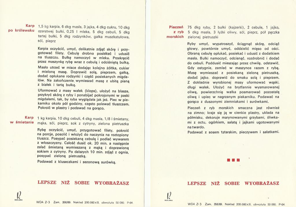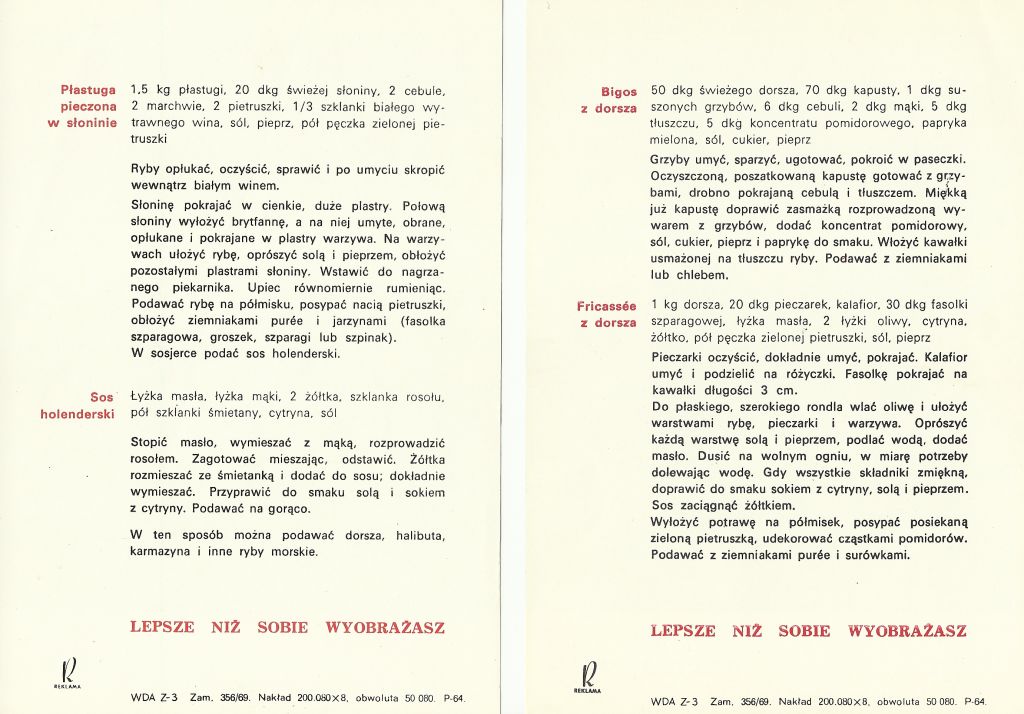 Po hasłem „Lepsze niż sobie wyobrażasz” znalazło się tu wiele wyjątkowych przepisów na dania z ryb. Śledź po śląsku, halibut a la Dobra Gospodyni, bigos z dorsza, płastuga pieczona w słoninie czy ostrobek a la flaczki – to tylko kilka z nich. Uwagę przykuwają piękne obrazy z drugiej strony przepisów. Oto wszystkie z nich: