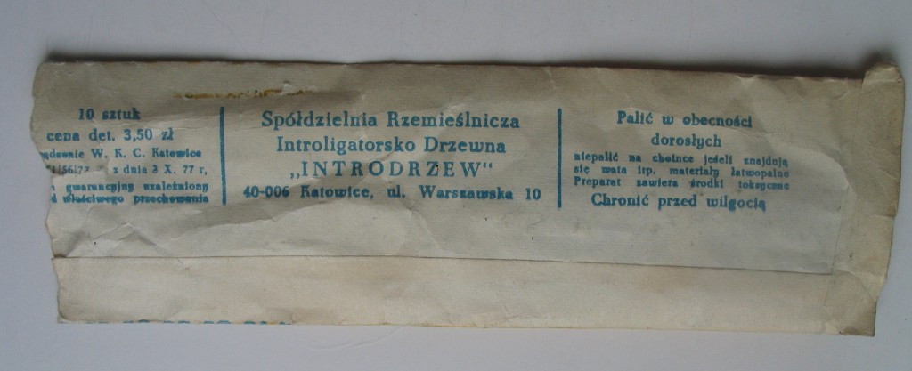 Obrót takimi środkami był oczywiście w PRLu ściśle kontrolowany. Nasz egzemplarz wyprodukowała Spółdzielnia Rzemieślnicza Introligatorsko Drzewna „Introdrzew” z Katowic. Cena za 10 sztuk wynosi 3,50 zł, a wyprodukowano je według normy z 1977 roku, czyli pochodzą z końca lat 70. albo z 80.
