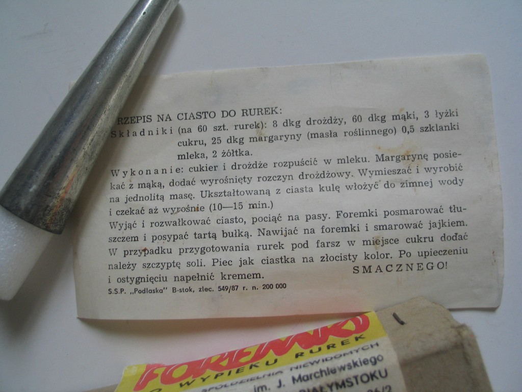 Wyprodukowany przez białostocką Spółdzielnię Niewidomych zestaw pochodzi z lat 80. i składa się z sześciu rożków. Co ważne, jest do tego dołożony przepis na ciasto.