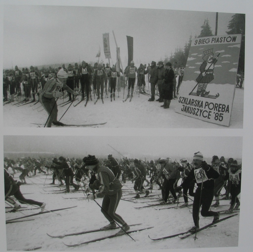 Drewno od spodu straciło już miejscami kolor, co było w tamtym czasie absolutnie normalne. Oczywiście w takie wiązanie nie włożyłoby się dzisiejszego buta narciarskiego, ale takich wtedy przecież nie było. Jeździło się w dresach i wełnianej czapeczce. Oto dowód z książki „Z prądem i pod prąd”. Zdjęcie ze Szklarskiej Poręby z połowy lat 80.