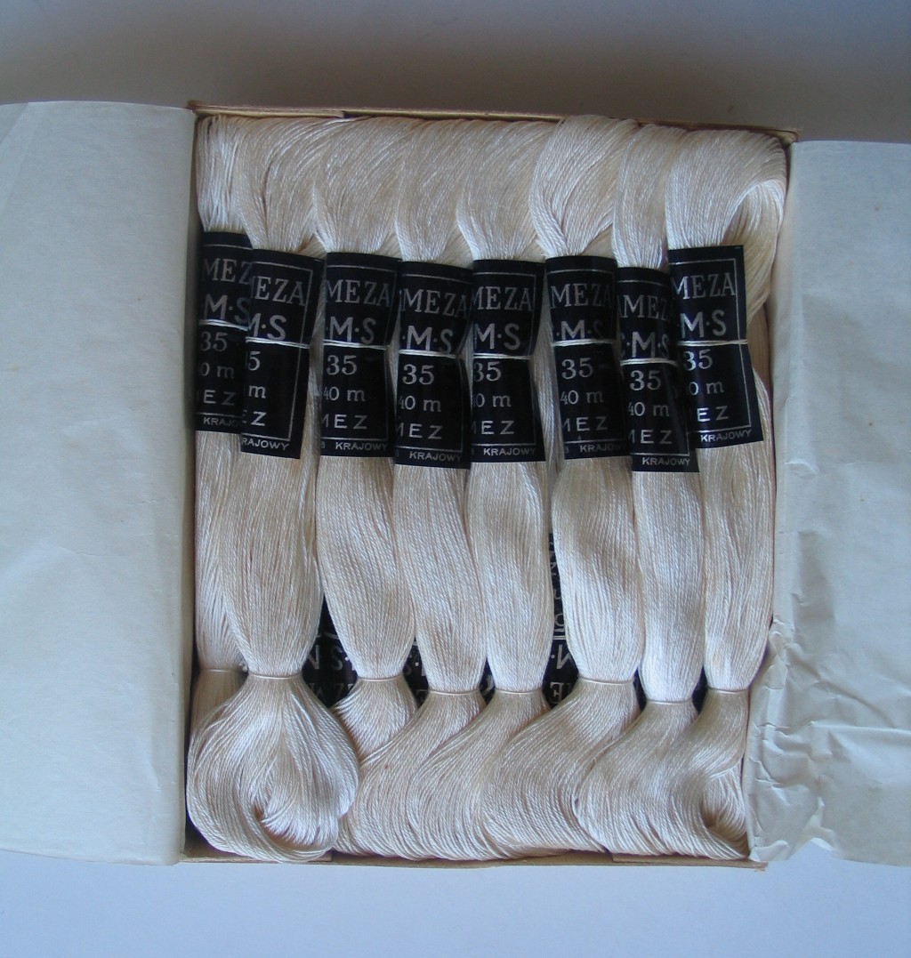I jeszcze jedno pudełeczko, tym razem z nićmi w środku. Niestety nie wiem z jakiego pochodzą zakładu, niespecjalnie orientuję się też co do oznaczeń, ale CMS to prawdopodobnie rodzaj nici. Może w tym przypadku pomożecie w rozszyfrowaniu symboli na pudełku.