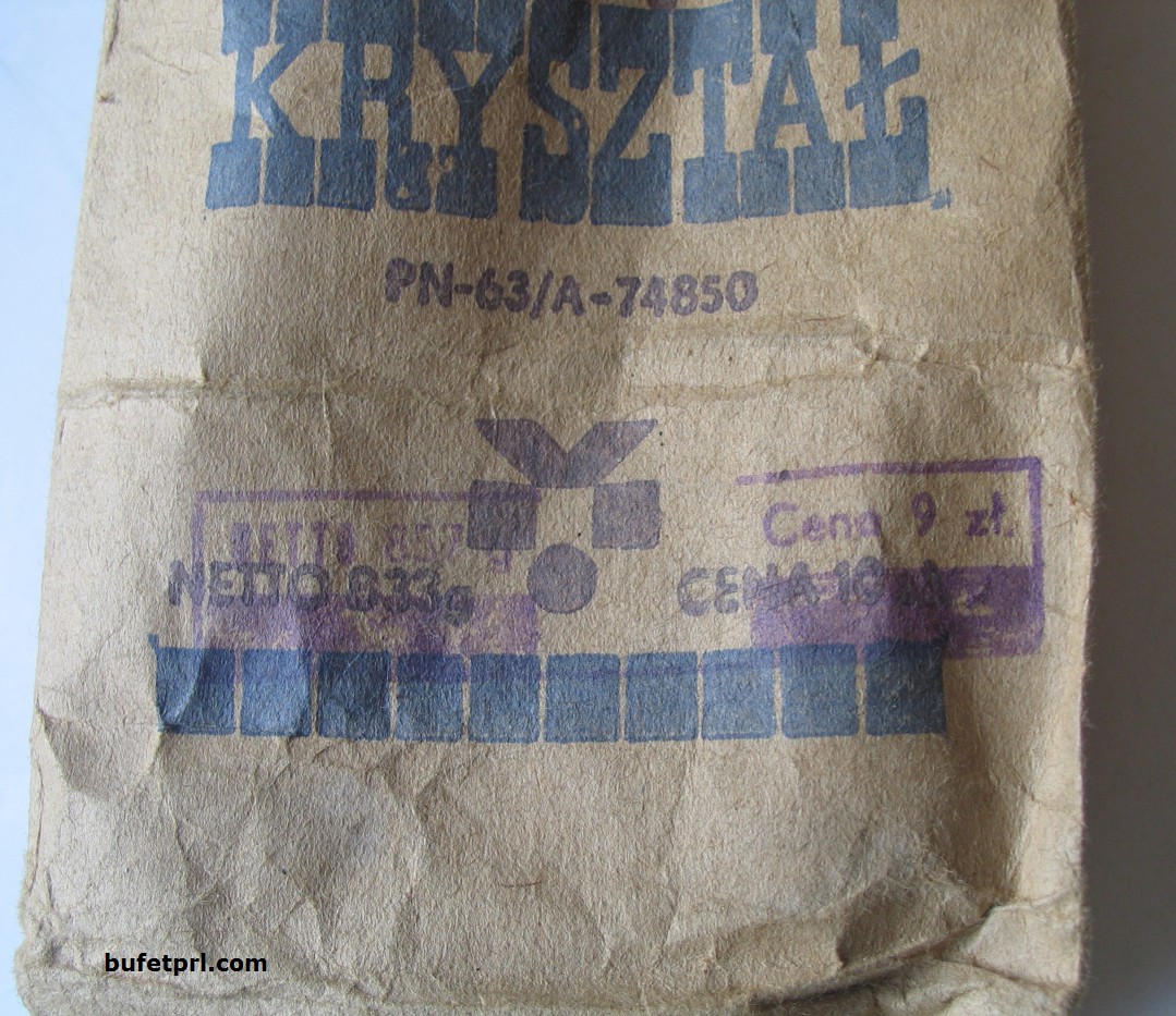 Cukier Kryształ Biały wytworzony według normy z 1963 roku znajdował się w popularnej wtedy brązowawej torebce. Z przodu można zobaczyć wagę i cenę, co ciekawe została zmieniona. Waga na mniejszą, a cena na większą.