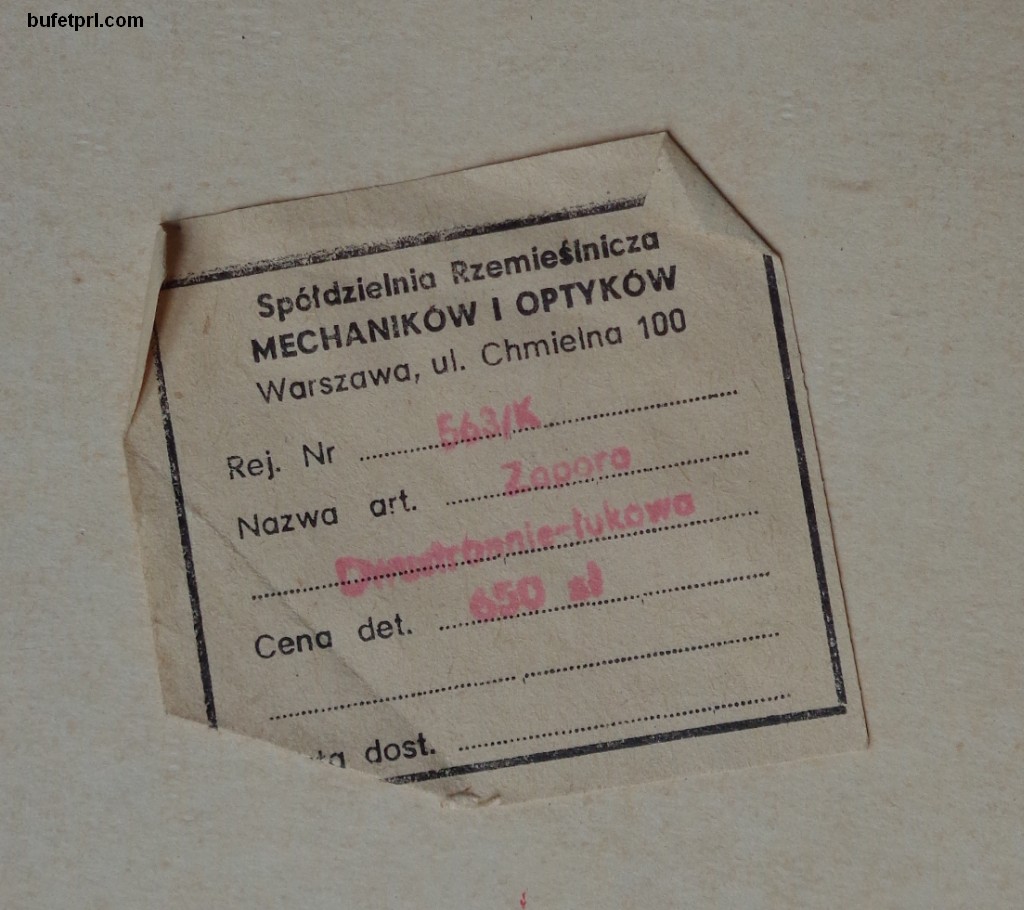 Zaporę wykonała Spółdzielnia Rzemieślnicza Mechaników i Optyków mieszcząca się przed laty w Warszawie przy ulicy Chmielnej 100. Kosztowała 650zł. Zapora, nie spółdzielnia.