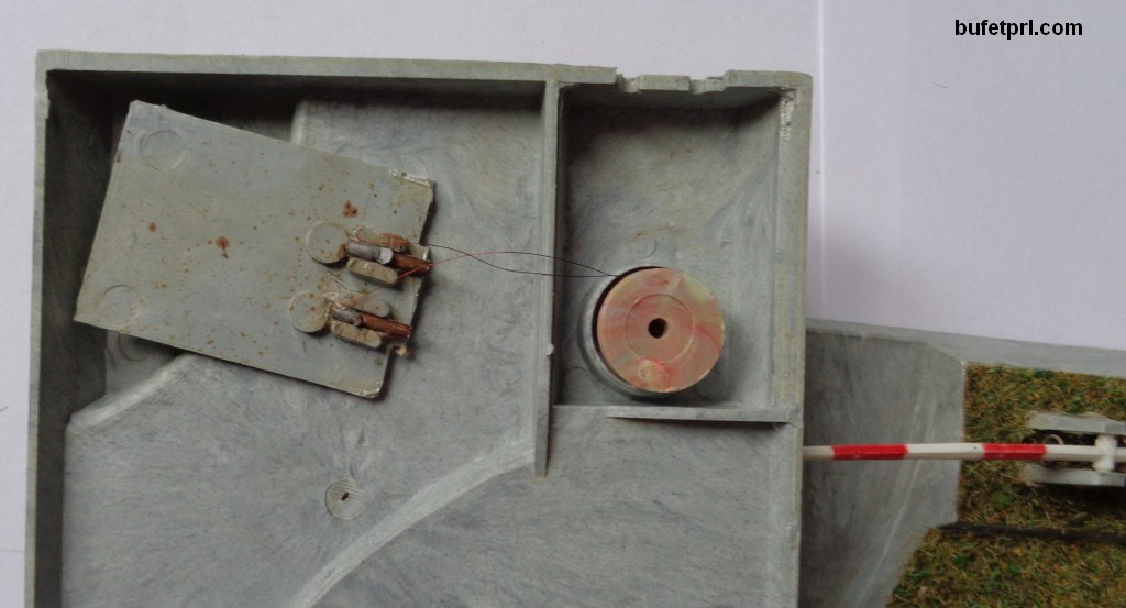 Jak widać, składa się z szlabanu, kawałka drogi, no i fragmentów zieleni. Pod spodem jest sprytny schowek do podłączenia zasilania.