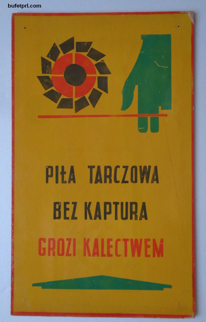 Wreszcie trzecia tabliczka, dla mnie najciekawsza. Może dlatego, że zawiera przerażające ostrzeżenie „piła tarczowa bez kaptura grozi kalectwem”. Też były różne wersje tej tablicy, na naszej ewidentnie widać, że dwa palce pan już stracił…
