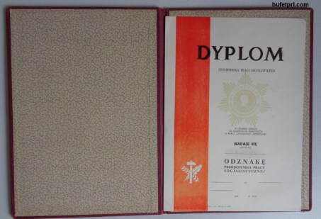 To dyplom, który potwierdzał nadanie odznaki przodownika pracy socjalistycznej. Wręczano je od końca lat 40 do 80 zeszłego wieku. Przypominał trochę świadectwo z czerwonym paskiem, z tym, że nie za dobre wyniki w nauce, a „w uznaniu zasług za szczególne osiągnięcia w pracy zawodowej i społecznej”.
