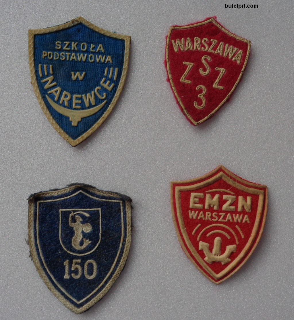 Najpierw naszywki szkolne, czyli tarcze. Chyba każdy, kto żył w PRL-u nosił fartuszki z tarczami. Ja w rodzinnym Słupsku też miałem przyszytą tarczę do niebieskiego fartucha. Miałem klasyczną czerwoną. Jak widać na zdjęciu, bywały też inne kolory.