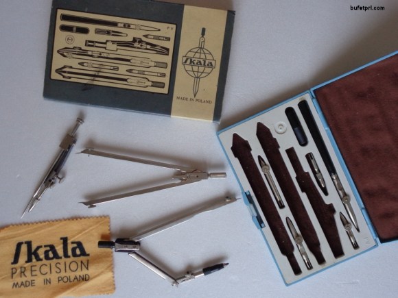 Są cyrkle, jakieś rysiki, nawet do końca nie wiem jak to się wszystko nazywa. Przy okazji, warto dodać, że Skala robiła nie tylko przyrządy kreślarskie, ale również na przykład lampy dla kreślarzy albo stoły.