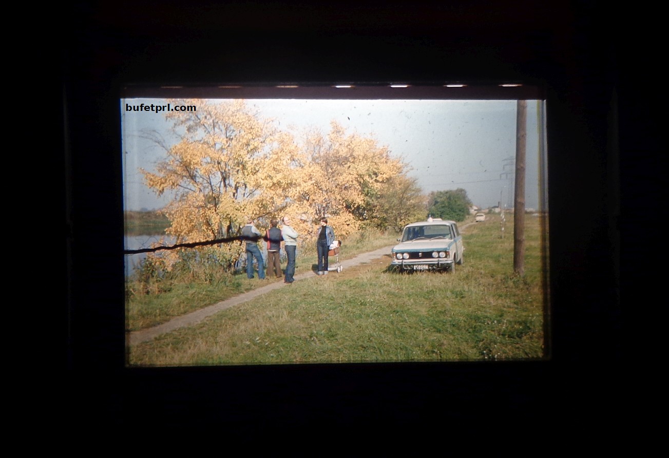 …oczywiście slajdy. Pokazują przełom lat 70 i 80. Otworzyliśmy to rodzinne archiwum, żeby pokazać wam, jak wtedy wyglądał świat na zdjęciach. Zostały zrobione głównie w Warszawie. Widać tu parę nad Wisłą. W wózeczku mała dziewczynka. Tak wyglądała moda końca lat 70. Skóra, jeansowe spodnie – pewnie z Peweksu, wąs i krótkie włosy – oj nie było żartów.