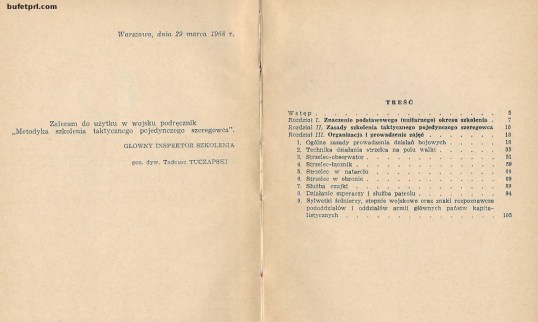 To spisy treści z dwóch podręczników. Piękne są tu rozdziały: Służba czujki, Działanie szperaczy i służba patrolu, Wykonanie zapory pochyłej, Obsługa ręcznego granatnika przeciwpancernego w obronie
