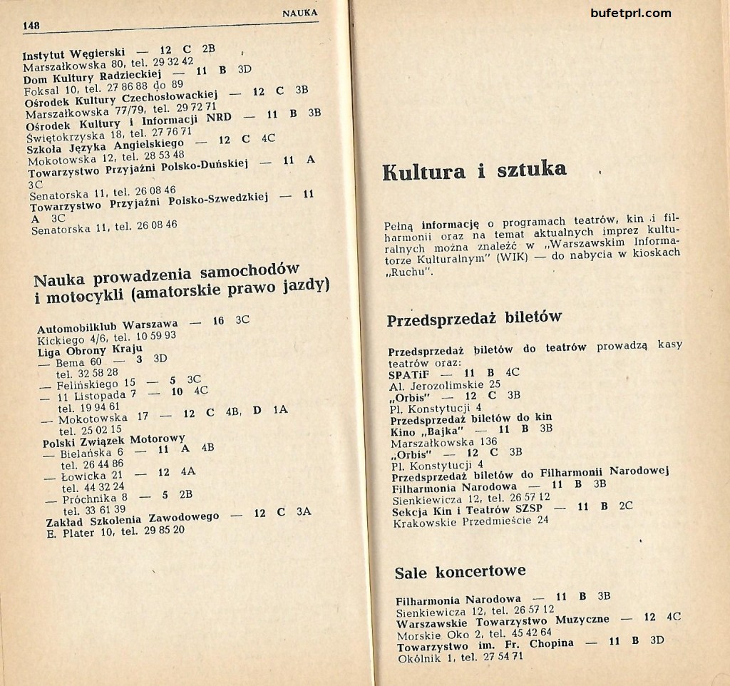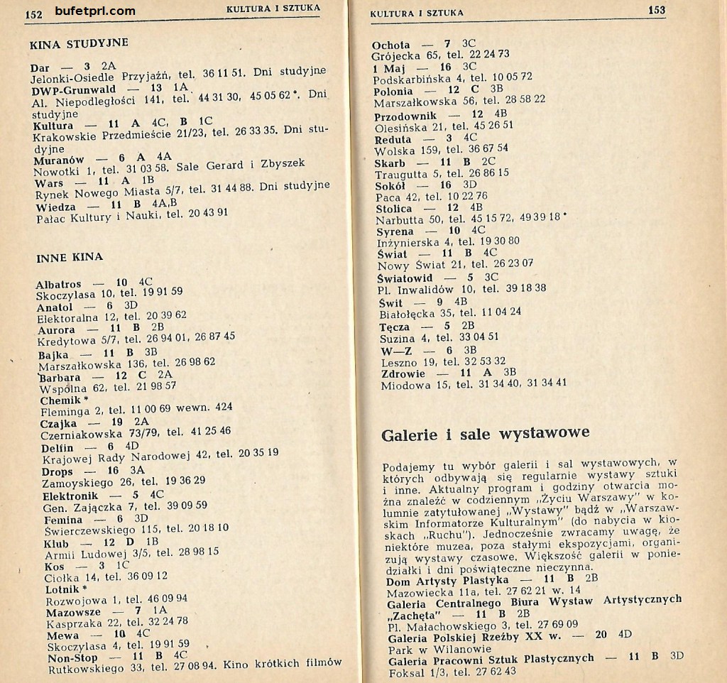 Tym razem, sekcja „Kultura i sztuka”. Pierwsza informacja jest taka, że wszelkie repertuary ukazywały się wtedy w kioskach w „Warszawskim Informatorze Kulturalnym”. Informuje o tym pierwsza strona tej sekcji. Jest też wykaz miejsc przedsprzedaży biletów do kin i teatrów.