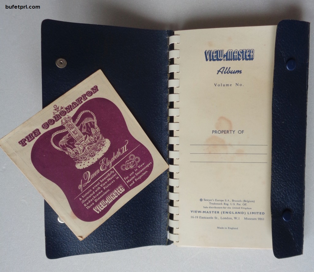 To piękny zestaw mini fotografii do View Mastera. Są dwa rodzaje obrazków w tym albumie. Kolekcja zdjęć z koronacji królowej Elżbiety z 1953 roku oraz fotografie krajobrazów z różnych krajów, Włoch, Szwajcarii, Holandii, Londynu, Kornwalii.