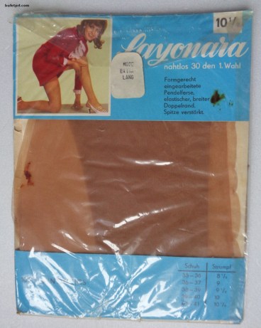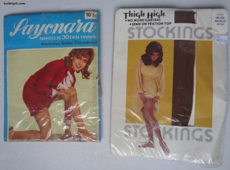 Taki nylonowy okaz, ten na zdjęciu po lewej, pochodzi z Niemiec. Pewnie zdobyty w Peweksie albo przywieziony. Sayonara o dużym rozmiarze, nadawały się chyba na wyjątkowe okazje – przynajmniej tak wynika ze zdjęcia pani na opakowaniu.