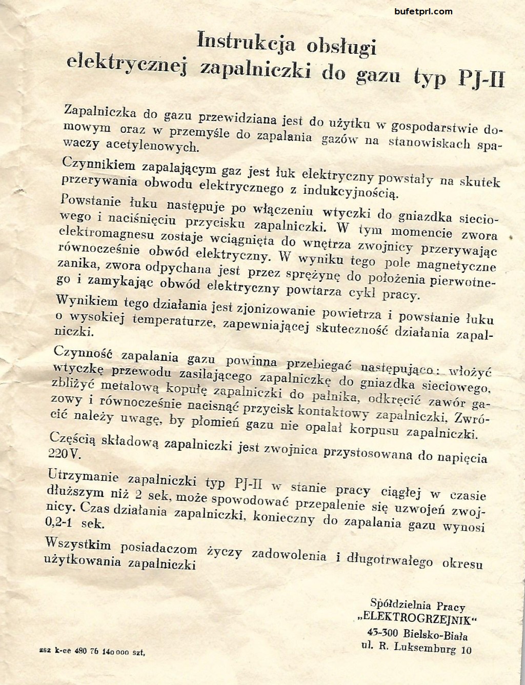 98 zł – tyle trzeba było zapłacić za iskrę, która zapalała palnik gazowy. Po co zużywać zapałki, skoro jest Elektryczna zapalniczka do gazu Typ PJ-II.