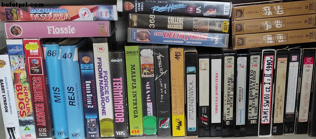 Oglądam kasety VHS, które zajmują górną półkę. Są przeboje lat 90.: Życie Carlita, Speed, Kasyno. Właściciel ma też katalog z okładkami filmów schowanych na zapleczu. Rozmawiamy oczywiście o filmach, o wypożyczalni.