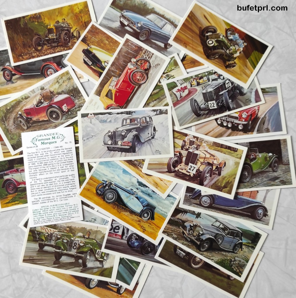 Kolejne karty to seria Grandee Famous M.G. Marques. Też wypuszczone przez markę papierosów. Karty z kolekcji mają z tyłu opisy, numery, zbierało się je do specjalnych albumów. Mam tutaj cały zestaw 28 kart wypuszczonych na rynek w 1981 roku. Za obrazki odpowiada specjalizujący się w malunkach transportu James Dugdale.