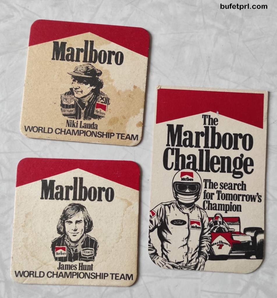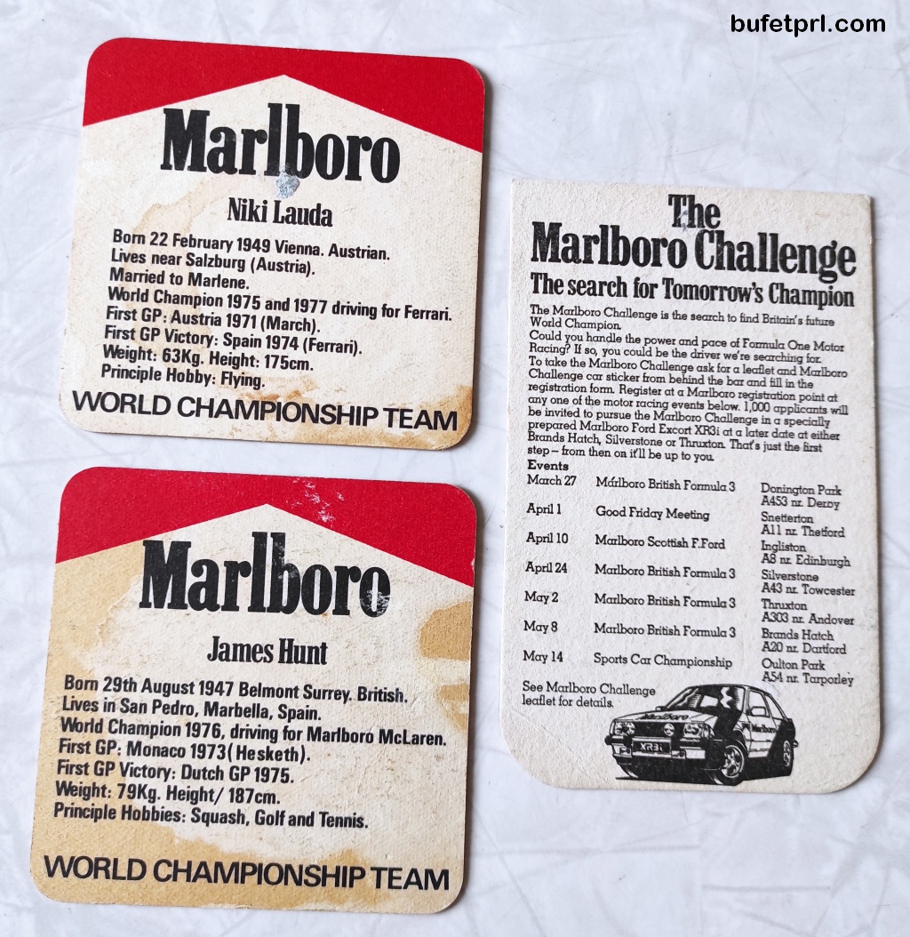 Na początek wyjątkowe gadżety, czyli wafle/podstawki od Marlboro. Widać, że używane, ale jakie piękne. Ta marka papierosów jest obecna w Formule 1 już od lat 70. Bolidami z logo Marlboro jeździli najwybitniejsi kierowcy wyścigowi Emerson Fitipaldi, Ayrton Senna, Alan Prost, Michael Schumacher, ale też ci z pokazanych wafli, czyli James Hunt oraz Niki Lauda. Pierwszy mistrzostwo F1 zdobył w 1976 roku. Drugi trzykrotnie.