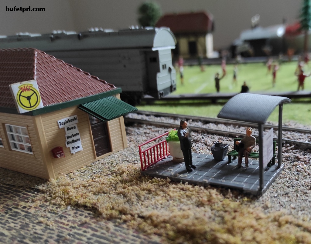 Jak widzicie jest też rozkład jazdy (prawdziwy!), klomb z kwiatami, ławka, płot, śmietnik, skrzynka na listy, no i pan Janusz z buteleczką ulubionego napoju. A pksowy bar oferuje m.in. kawę, herbatę, kiełbasę, no i piwo.