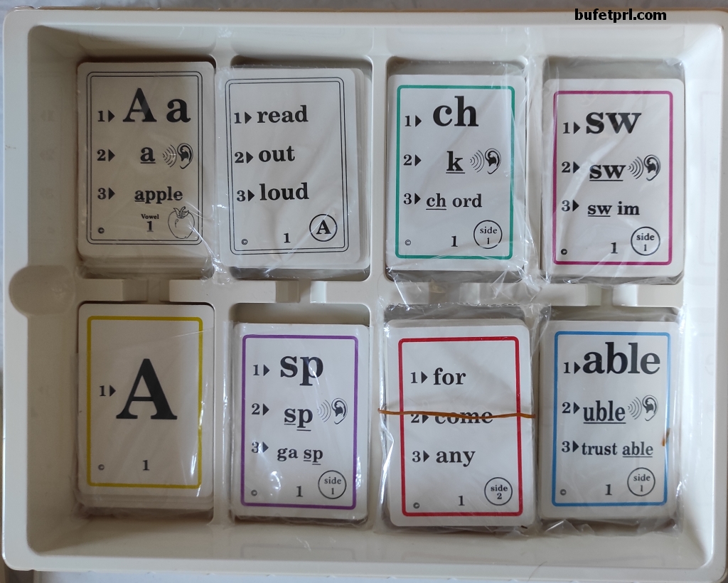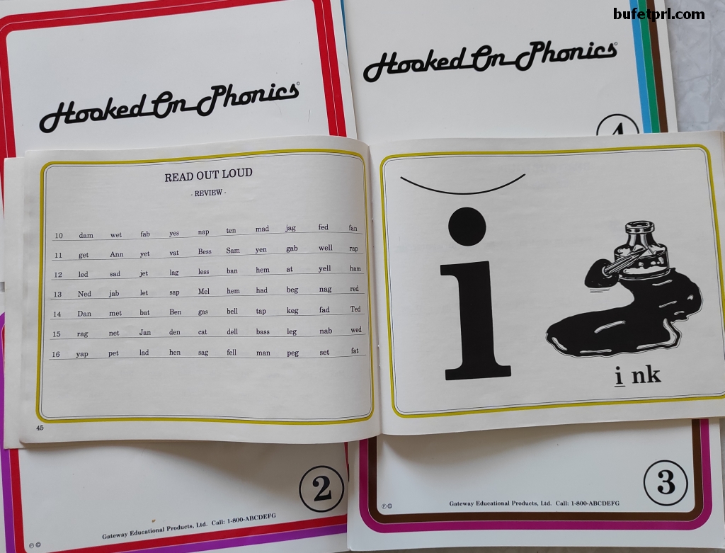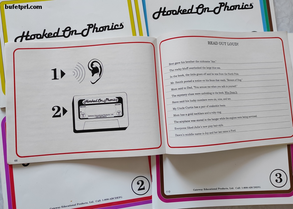 Osiem kaset, niesamowity zestaw do nauki języka na dłuuugi czas. Przygotowała go amerykańska firma Hooked on Phonics, która zresztą istnieje do dziś. Pełen pakiet zawiera kasety, specjalne karty i książeczki z ćwiczeniami.