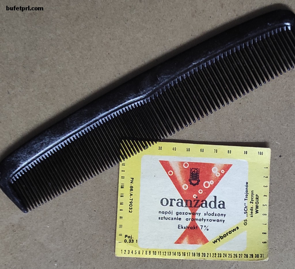 Oryginalna etykieta po oranżadzie wyborowej z lat 80. oraz oryginalny grzebień z PRL. Nieśmigany, nówka. Idealny do tylnej kieszeni spodni 🙂
