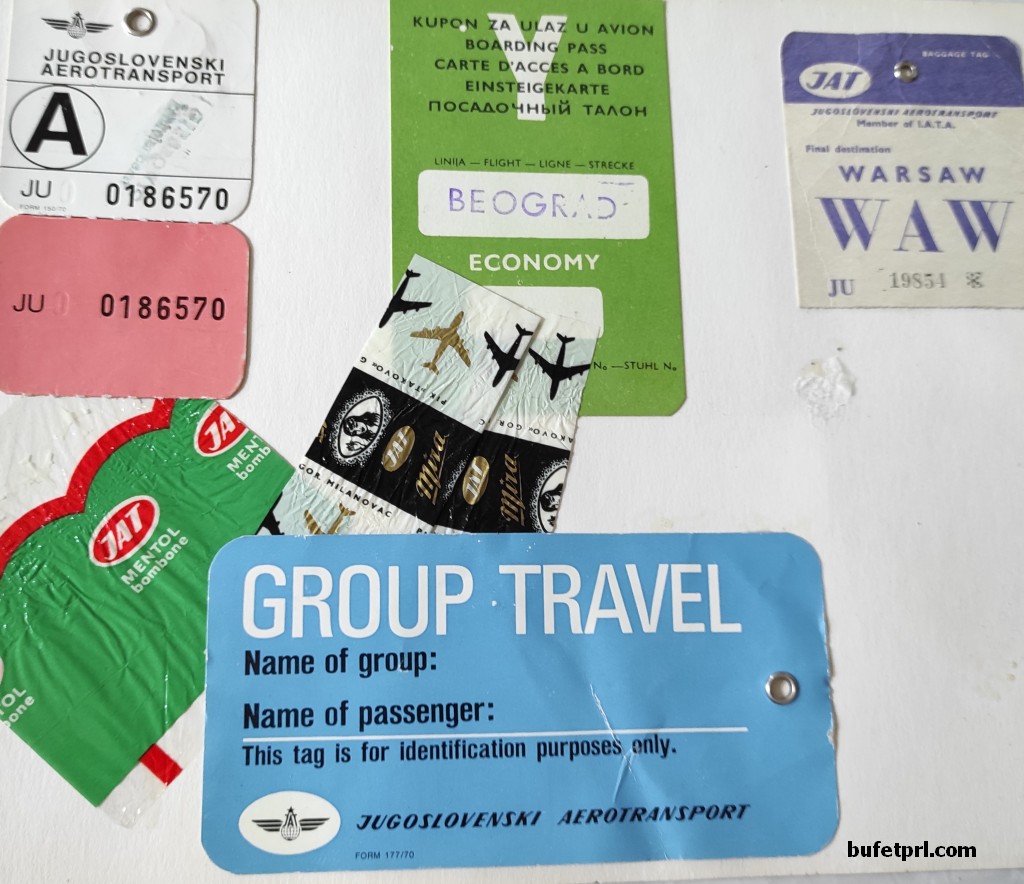 Bilety lotnicze, karty boardingowe Jugosłowiańskich Linii Lotniczych JAT, a nawet ich miętowe cukierki. Ciocia zachowała też kilka zdjęć z podróży.