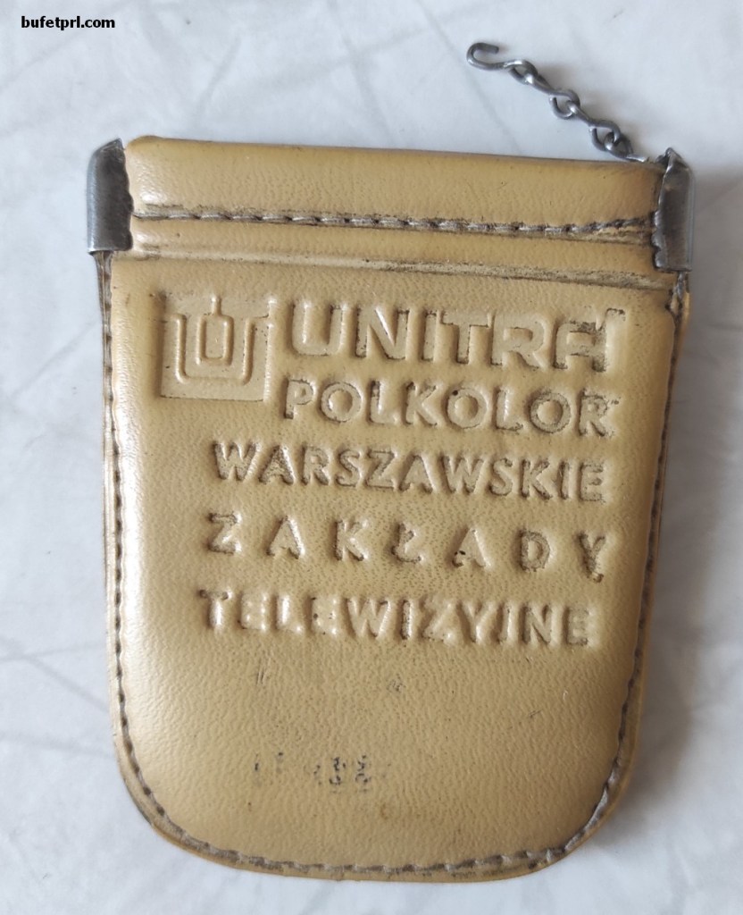 Etui na klucze z jasnej skóry, z metalowym sznurkiem i logo Unitra Polkolor Warszawskie Zakłady Telewizyjne. To przedsiębiorstwo produkujące od 1976 roku kineskopy. Ten zakład mieszczący się w Piasecznie miał własną hutę szkła kineskopowego.
