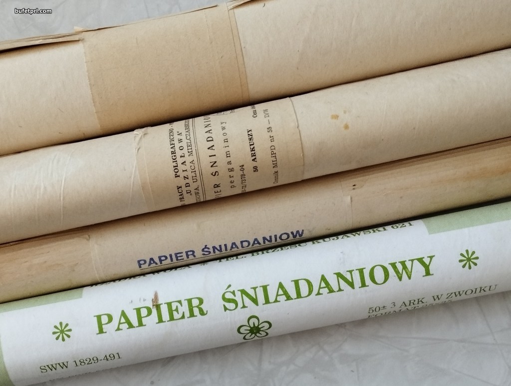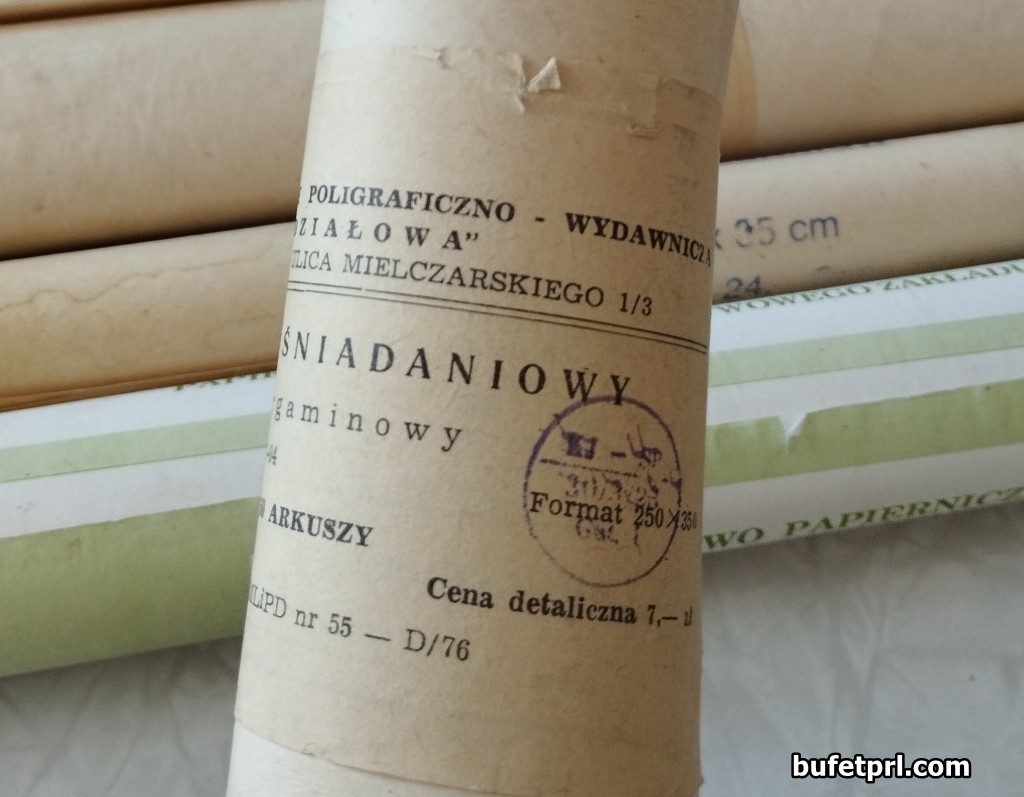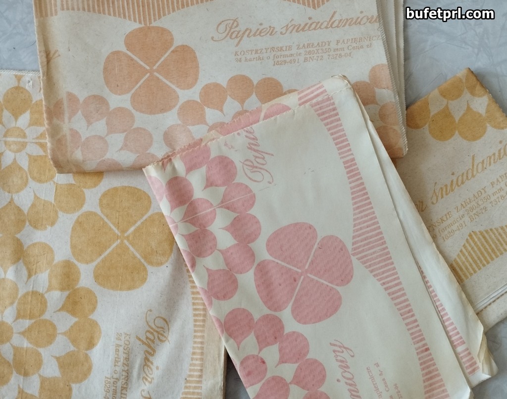 Papiery śniadaniowe produkowały różne zakłady papiernicze i poligraficzne. Są tu papiery zwykłe, szare, jak ten ze Spółdzielni Pracy Poligraficzno-Wydawniczej „Udziałowa” z Częstochowy. Mam już kilka skarbów z tej spółdzielni, bo oni produkowali też zabawki. Na przykład taką perełkę, o której pisałem TUTAJ: https://bufetprl.com/2012/05/09/wyslij-telegram-w-milym-towarzystwie/