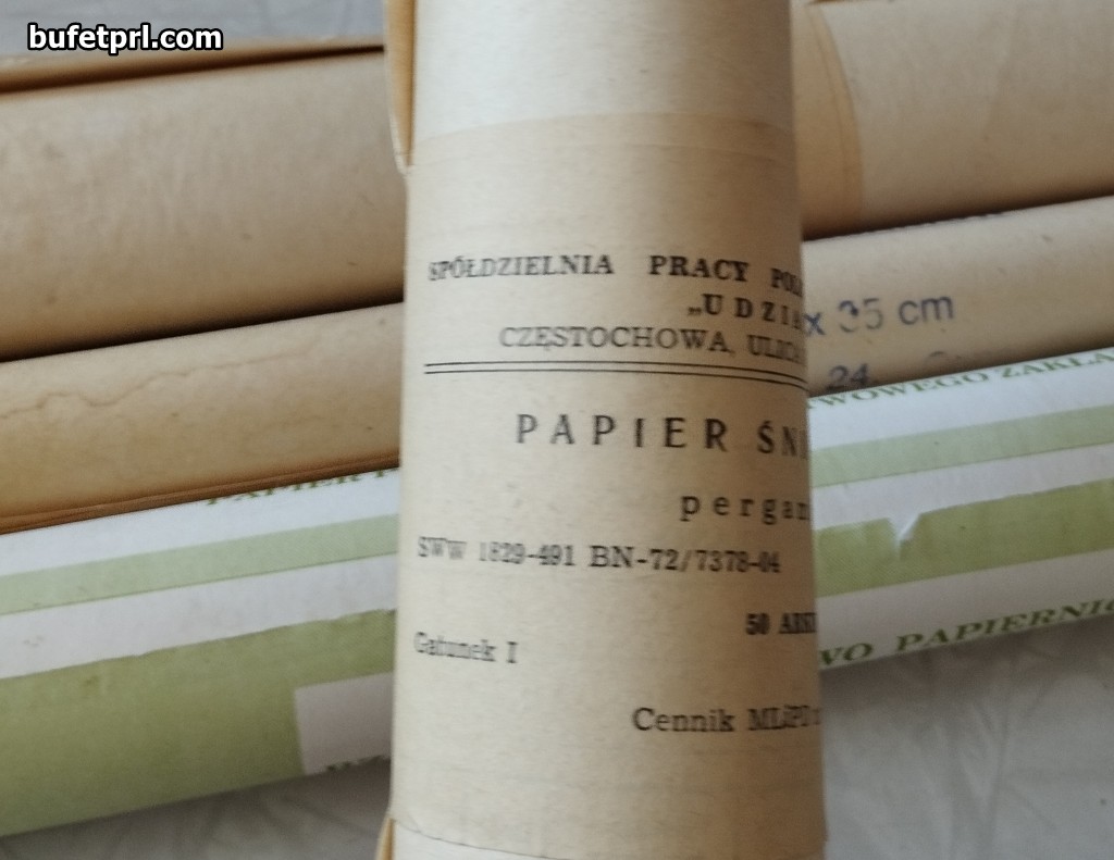 Wracając do tego papieru. Jest gatunku 1, pergaminowy, a jego cena to 7 zł. W zestawie mam też papier bez pieczątki zakładu oraz taki zawinięty w zieloną owijkę z zakładu Przetwórstwo Papiernicze Rzadka Wola z Brześcia Kujawskiego. Tu jest istotna informacja, że „papier posiada atest Państwowego Zakładu Higieny”.