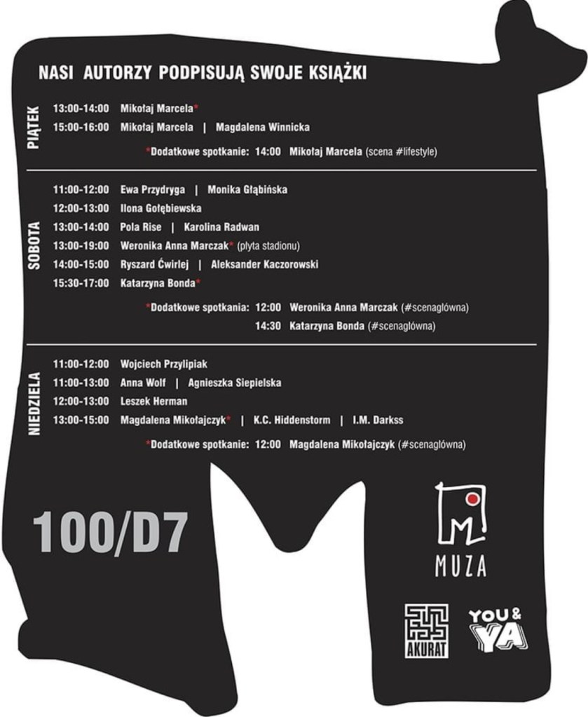 Chętnie podpiszę swoje książki, ale wezmę też kilka super gadżetów sprzed lat, a w ogóle to świetnie będzie po prostu pogadać. Wpadajcie, będzie mi miło. Tu rozpiska MUZY: