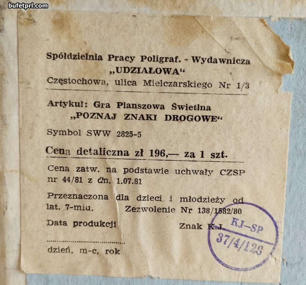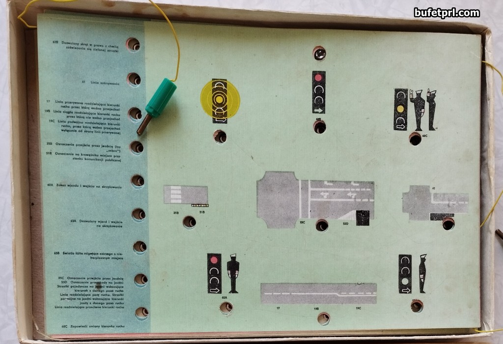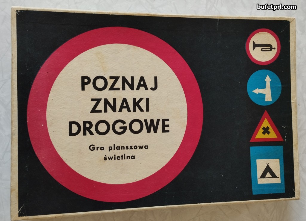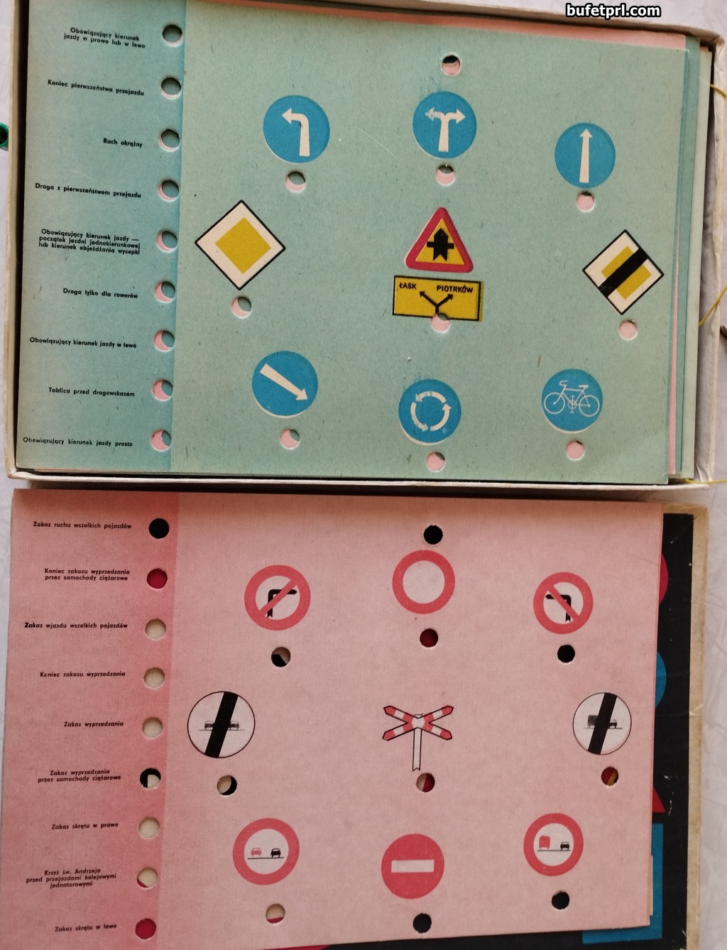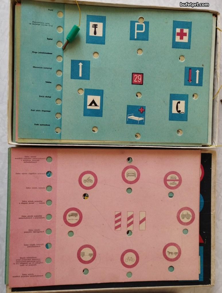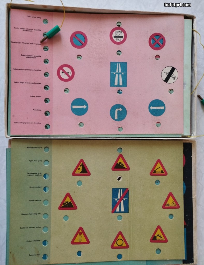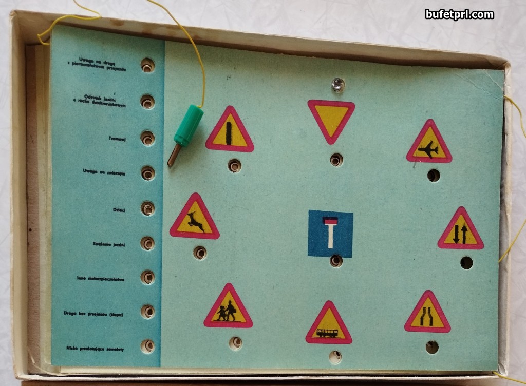 Gra planszowa świetlna „Poznaj znaki drogowe” to produkt Spółdzielni Pracy Poligraficzno-Wydawniczej „Udziałowa” w Częstochowie. Mam już kilka skarbów od nich, pisałem tutaj: https://bufetprl.com/2018/03/14/alfabet-dydaktyczny/