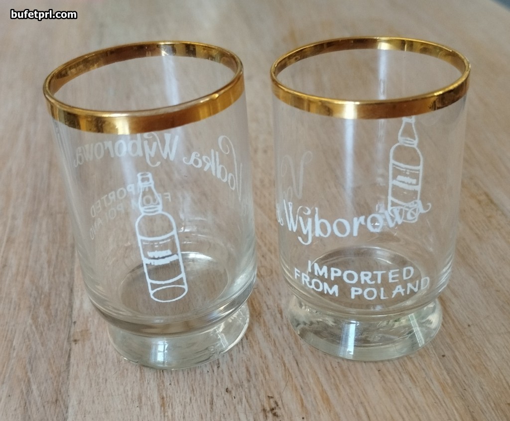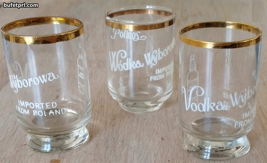 Pierwsze (dwie sztuki) z napisami i buteleczkami. Na nich zresztą też widoczny napis: Vodka Wyborowa. Poza tym „imported from Poland”, czyli były sprzedawane za granicą. Zresztą o luksusie świadczy pozłacany rant.