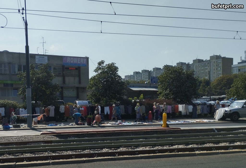 Sprzedawcy ustawiają się na chodniku wzdłuż bazaru od ulicy Obozowej, wokół przystanku, ale też w alejkach na samym bazarze. Jest trochę ciuchów, ale głównie jakieś przedmioty sprzed kilku albo kilkudziesięciu lat.