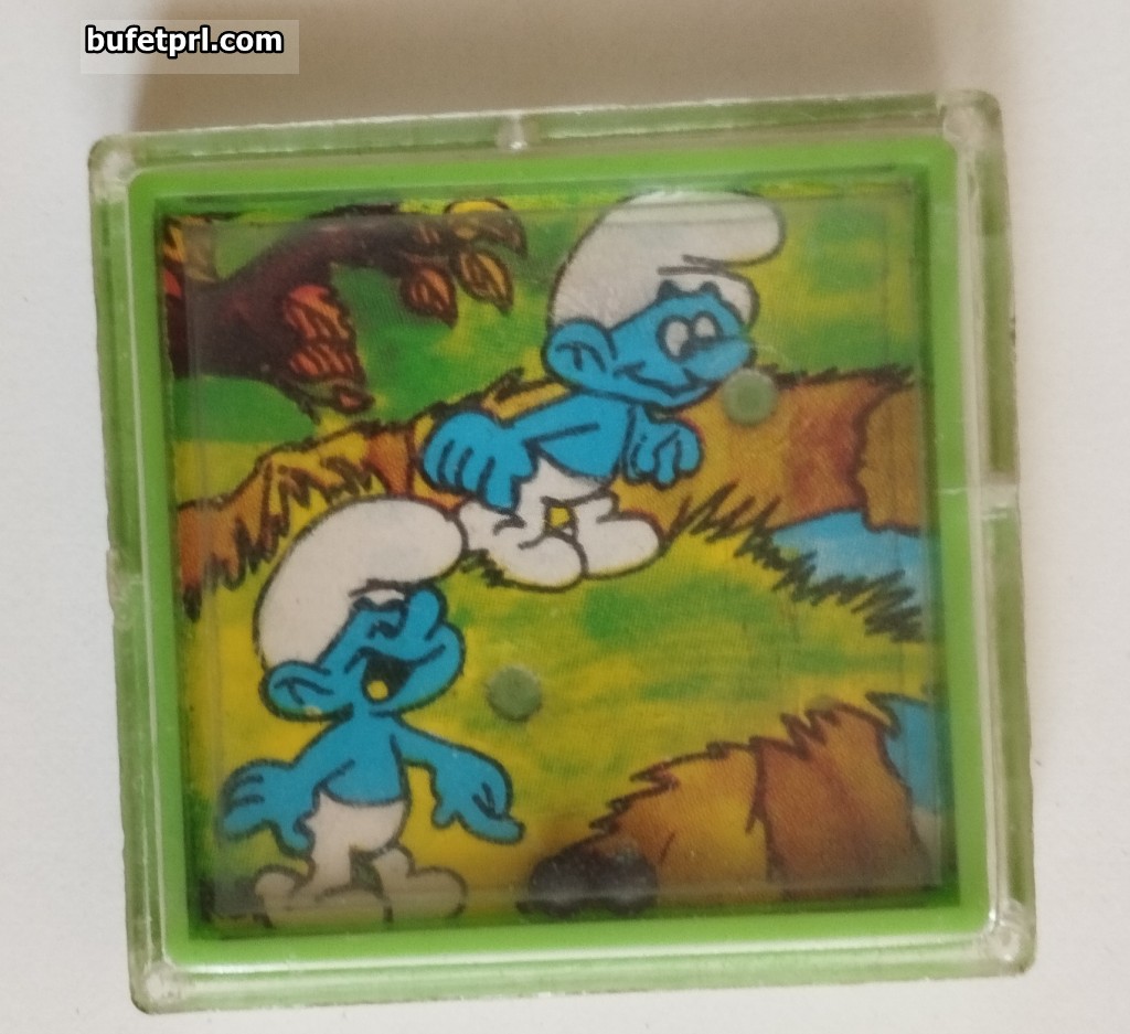 Najpierw taka zabaweczka. Banalnie proste pudełeczko ze smerfowym obrazkiem, dwoma wgłębieniami i dwoma kulkami. Trzeba nim tak balansować, by kulki trafiły do dziurek. Nie ma tu nazwy producenta, prawdopodobnie jest to zabawka z lat 80., od jakiegoś rzemieślnika-prywaciarza.