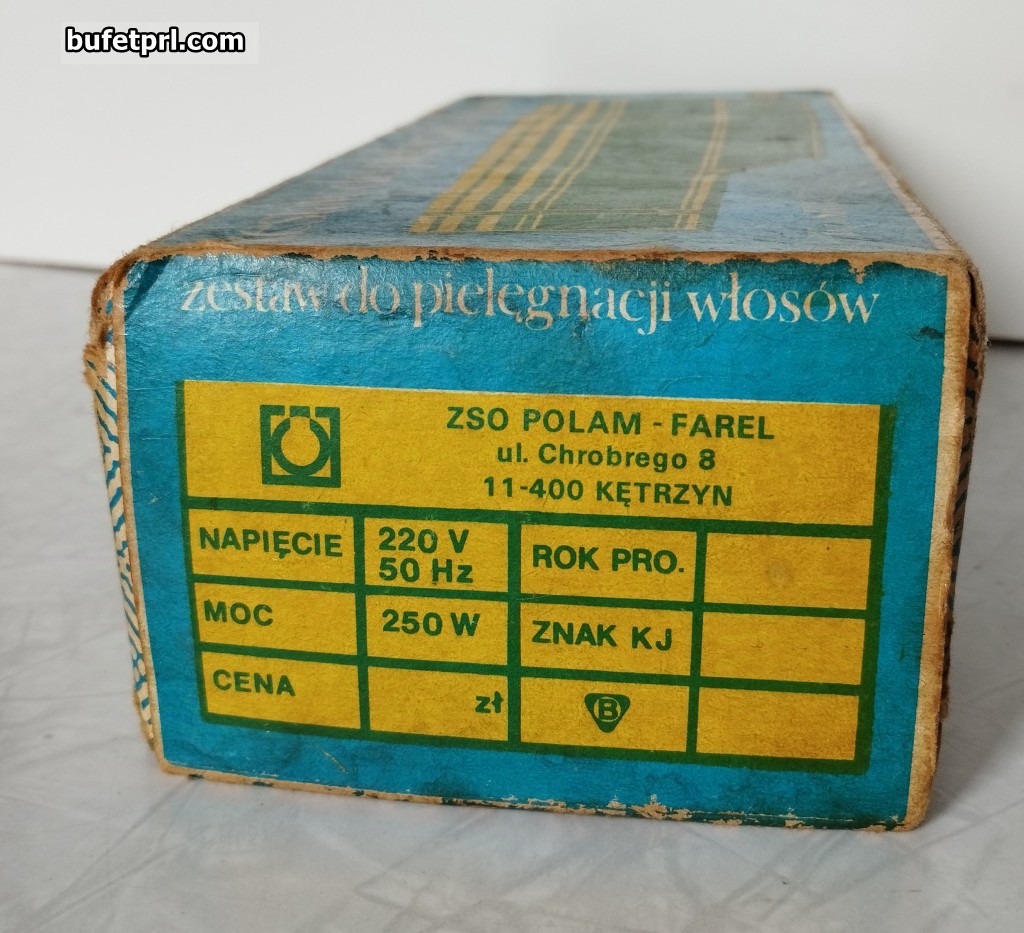 Jak widać ten zestaw do pielęgnacji włosów wyprodukował zakład Polam-Farel w Kętrzynie. Jego początki sięgają lat 40. XX wieku. Powstałe w byłych koszarach wojskowych zakłady produkowały m.in. słynne grzejniki „farelki”. Najpierw należały do zjednoczenia Predom, a od początku lat 70. do Polam.