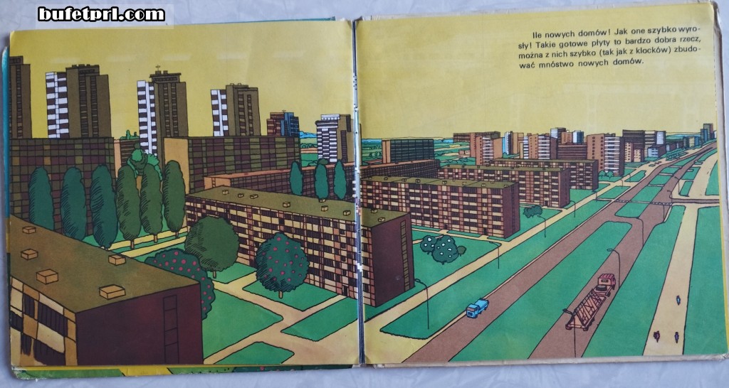 W rzeczywistości nie było tak różowo, jak na tych obrazkach. Prefabrykaty były niskiej jakości, mieszkania niewysokie. Przez dekady jednak zmontowano sporo tych klocków.