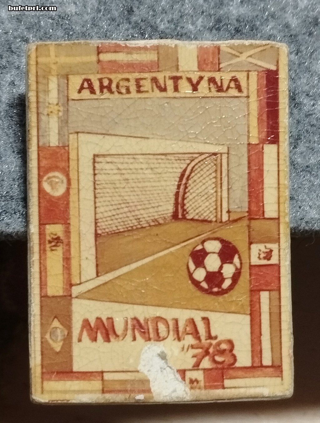 Z Mistrzostw Świata w piłce nożnej z 1978 r., w których udział wzięła Polska. Nasza reprezentacja uplasowała się na miejscach 5-8. Ciekawie namalowany jest ta przypinka, jakby ręcznie.