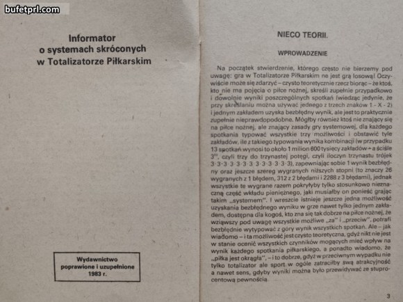 Najpierw poradnik, czy bardziej informator o systemach w Totalizatorze Piłkarskim. Ważne stwierdzenie w pierwszym zdaniu: „gra w Totalizatorze Piłkarskim nie jest grą losową!„. To bardziej przewidywanie. Poradnik opisuje systemy, oznaczone tu jako P, W, Q, M, S, E, K. Oczywiście nic z tego nie rozumiem. Wiem tylko, że mecze polskiej ligi, ale też angielskiej można było u nas obstawiać od końca lat 50. XX wieku. Przeglądając małą książeczkę wiem, że obstawianie wcale nie było takie proste.