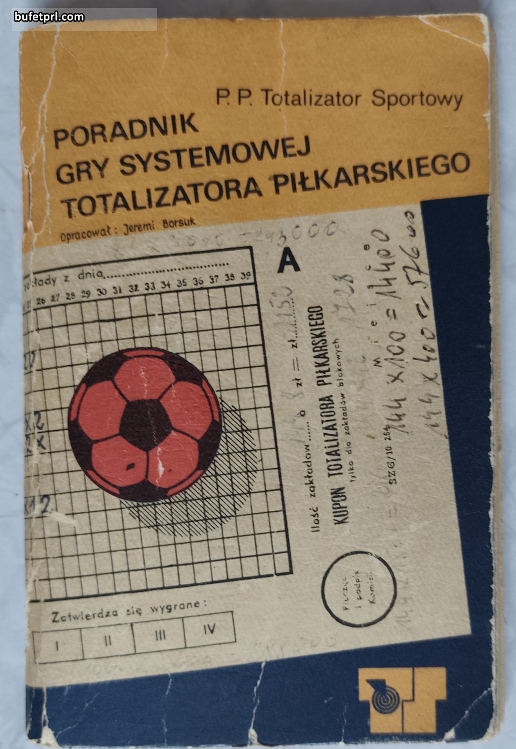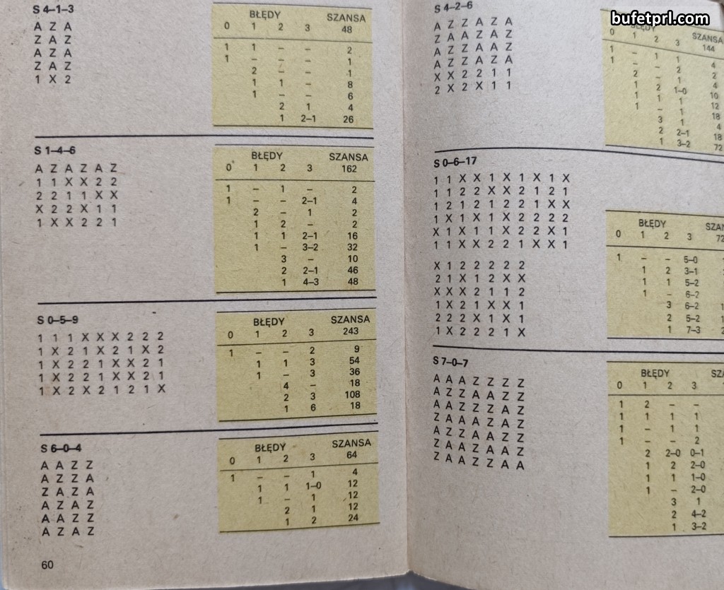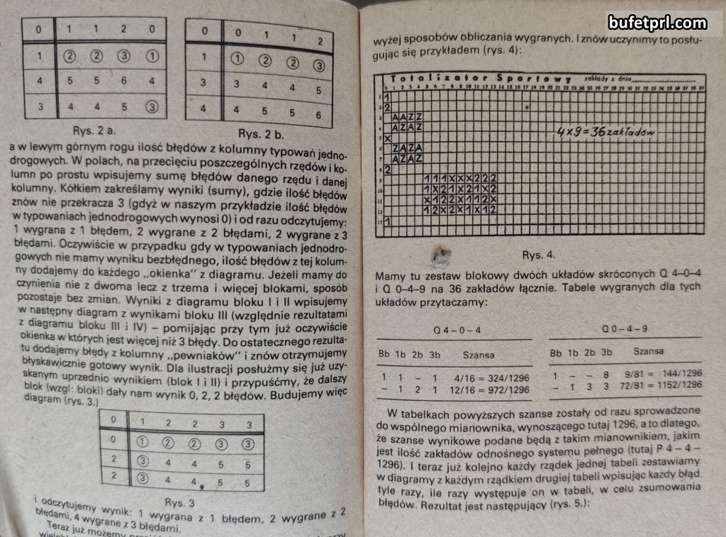 Najpierw poradnik, czy bardziej informator o systemach w Totalizatorze Piłkarskim. Ważne stwierdzenie w pierwszym zdaniu: „gra w Totalizatorze Piłkarskim nie jest grą losową!„. To bardziej przewidywanie. Poradnik opisuje systemy, oznaczone tu jako P, W, Q, M, S, E, K. Oczywiście nic z tego nie rozumiem. Wiem tylko, że mecze polskiej ligi, ale też angielskiej można było u nas obstawiać od końca lat 50. XX wieku. Przeglądając małą książeczkę wiem, że obstawianie wcale nie było takie proste.