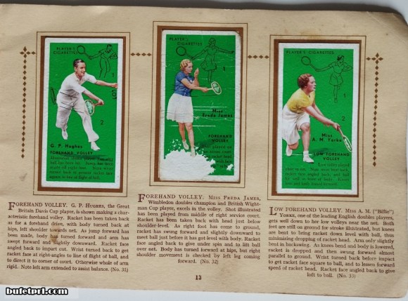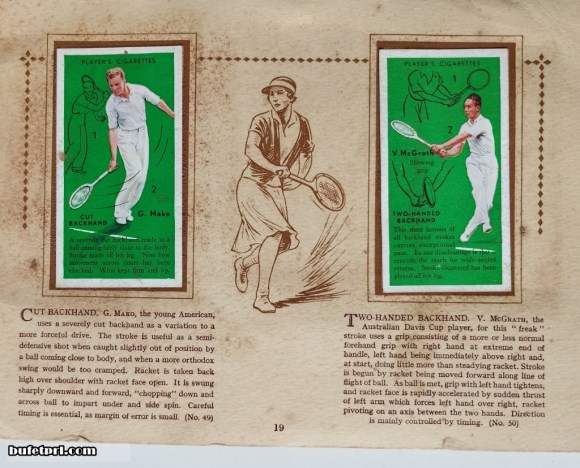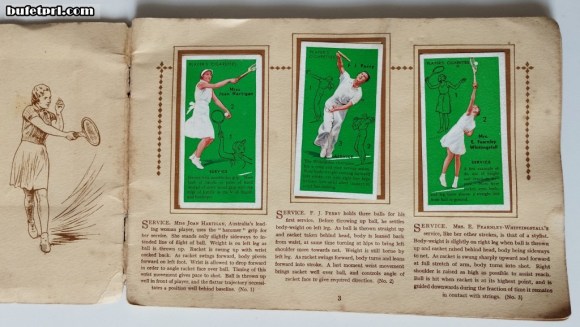 Album z kolekcjonerskimi kartami dołączanymi do papierosów. Jakież piękno i dbałość o szczegóły. Są tutaj legendy światowego tenisa, przedwojenni mistrzowie. F.J.Perry (8 wielkoszlemowych zwycięstw, a do tego mistrz świata w tenisie stołowym), Eileen Bennet Whittingstall (6 wielkich szlemów, pierwsza tenisistka, która nosiła spódnicę powyżej kolana)… no dobra, jest tu kilkadziesiąt słynnych nazwisk tenisistek i tenisistów z całego świata. Zostali tu podzieleni na specjalistów w różnych tenisowych elementach. Są serwisy, woleje, drive’y, backhandy, forehandy itp.