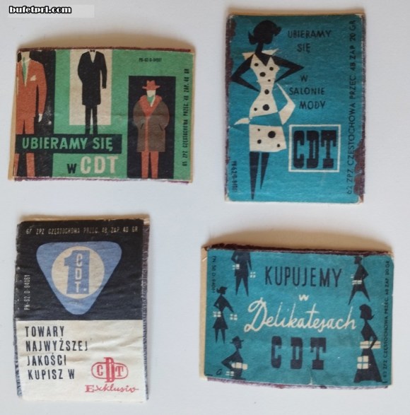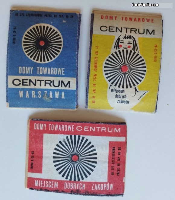 Poprzez etykiety reklamowały się też duże sieci handlowe, czyli PDT-y (Powszechne Domy Towarowe), CDT-Y (Centralny Dom Towarowy) oraz Domy Towarowe Centrum. Te ostatnie mieściły się na reprezentacyjnej Ścianie Wschodniej przy ulicy Marszałkowskiej w Warszawie. Utrzymany w modernistycznej stylistyce kompleks składał się z trzech budynków mieszkalnych oraz czterech domów towarowych: Warsa, Sawy, Juniora (wszystkie trzy działały pod wspólnym szyldem Domy Towarowe Centrum) i Sezamu. Pierwszym, który został otwarty dla klientów, był Junior z asortymentem skierowanym do młodych ludzi. Nazwę wybrano w konkursie, w którym proponowano też m.in. Autostop, Kaśka, Młodzieżowiec, Narkotyk, Elvis, Teksas czy Europa. Słynęły z gadżetów, można było dostać siatki z domów Centrum, breloki itp. Mam zresztą kilka w swojej kolekcji. Fotki poniżej.