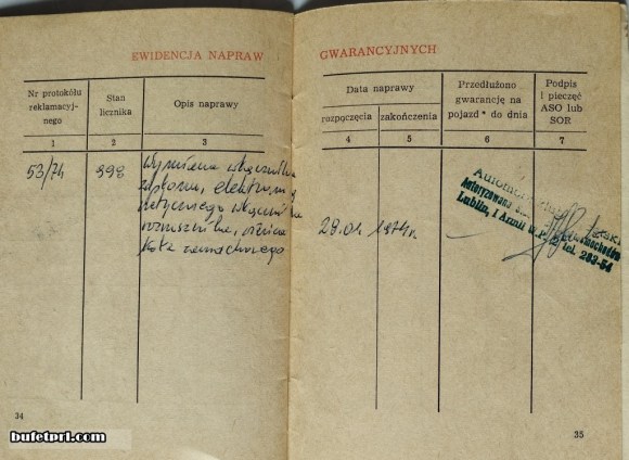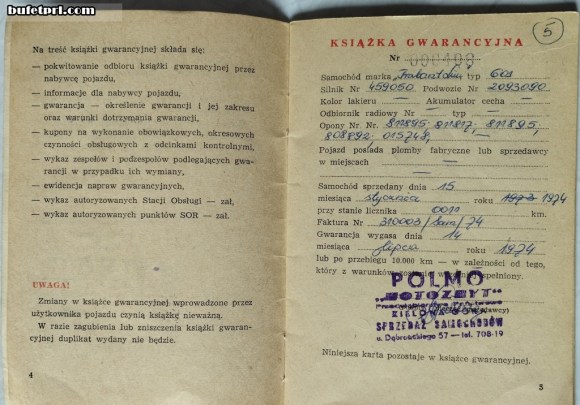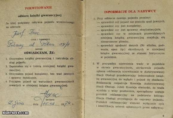 Wydana w Zielonej Górze była najważniejszym dodatkiem do aut, podawała zasady eksploatacji i konserwacji oraz warunki gwarancji. Uwaga: nie można było uzyskać duplikatu, więc lepiej było nie zgubić.